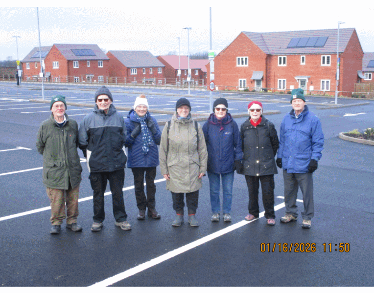 It was a dry but overcast day and 8 people met at the Hood Park gates and we set off along North Street and at the bend in the road, we took the footpath through Wainright's yard and soon we were at the kissing gate and on the better path which opens out by the new car park which had one car in it. We continued on the path accross the entry road to the new estate, Warner road. The path continued by the new houses, we took the right fork staying parallel to Nottingham road. The path then followed Gilby close and crossed Woodcock way. Followes a grassy area. Here we took another right fork that led to Plantagenet way and on to Featherbed lane which we turned right on until we found the footpath again which led to Discovery way and to Tesco's cafe. After a drinks break, we returned on the same path stopping for a photograph at the new car park which now had 4 cars. Total distance just over 1.5 miles