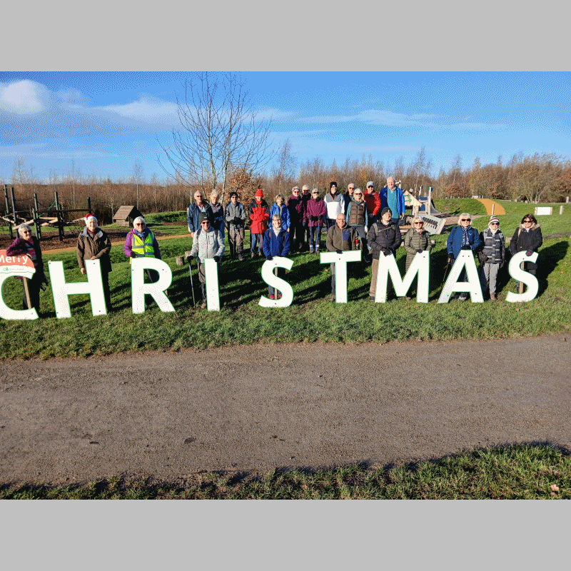 After leaving the car park we quickly entered Hicks Lodge Park and took the uphill route at the side of the lake to the café, where we gathered in front of big letters spelling out ‘Christmas’ for the photograph. After crossing the road dividing the two halves of the site, we continued on good quality paths to a massive play area built to look like a cycle. Criss-crossing down the hill we continued on a circular route round the site returning to the café where we split into two groups with some choosing the slightly longer route round the opposite side of the lake and we all returned to the car park. Then we all went back to the Green household for soup and cake.