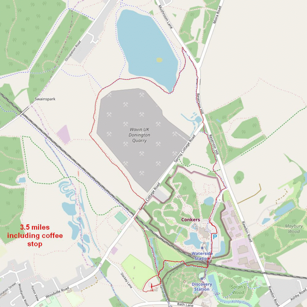 Photos by Johns H and D11 walkers met at Sarah's Wood car park on a cool and overcast day. We walked down the right hand path that takes you to the canal Basin at Conkers Waterside Court. We went towards the rail bridge but turned left onto the track over the kiddies rail track and around to the old disused rail track and turned left towards Measham. We followed the track as far as the first level track on our left back to the canal. At the canal we turned left toeards Moira Furnace where we stopped at the hub for a refreshment and comfort break, After the break we continued along the canal back to the canal basin but crossed the bridge to Sarah's Wood. Having crossed the newly refurbihed bridge we turned right following the other side of the canal and around to the other entry to the car park. Total distance just under 3 miles.