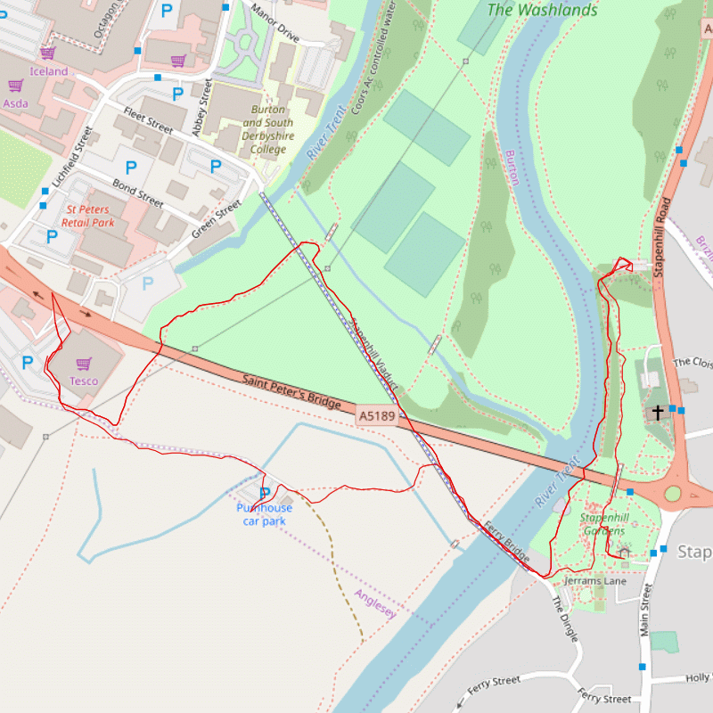 Photos by John Dogherty5 people met at the Stapenhill car park, the weather was poor with a slight drizzle. Because of the weather we decided to walk to the Costa coffee shop in Tesco's. We crossed the footbridge over the new bridge road and stopped for a toilet break in Stapenhill gardens. We then crossed on the Ferry bridge and headed to the Pumping station (no longer in use). There were a lot of puddles around but we managed to find a way through without getting too wet. We spent some time looking at the pump house and the various printed boards. The road to the car park passes close to the Tesco store where we stopped for a break and a chat. On leaving the shop we followed the footpath on the left as soon as we entered the washlands which was puddle free and passed under both the road bridge and the raised foot path. We then walked up to the raised foot path back the Ferry footbridge. We retuned to the car park along the riverside path which meant we had a good view of Stapenhill gardens. The walk was just over two miles and I have include both walk tracks as they both have us wading through the river.