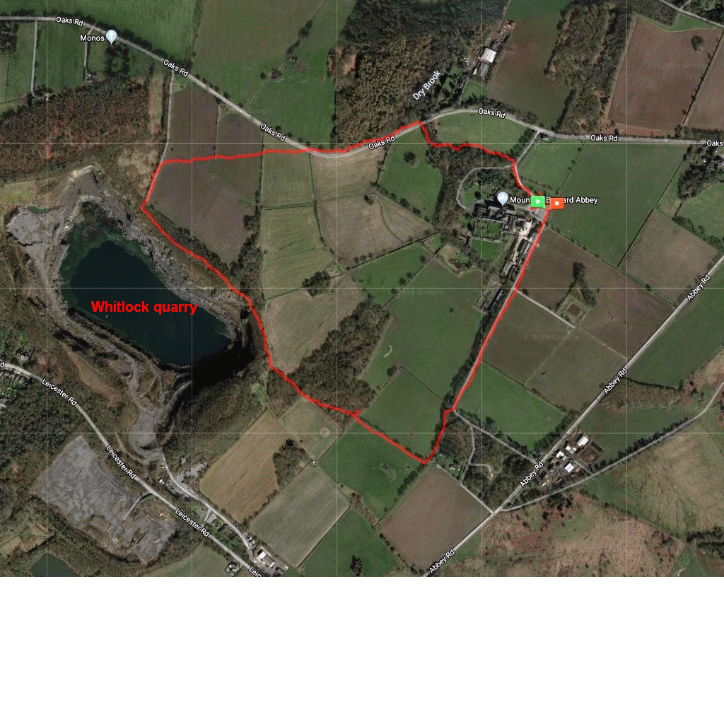Photos by John Dogherty and John Howlett6 walkers met at Mount St Bernard's Abbey. A friendly lady offered to take a photograph of us all before the Abbey. The weather was fine but not hot and we set off taking a footpath on our left as we left the car park. Down the hill to Oaks Road which passes the Abbey, we turned away from the Abbey and picked up the public footpath on our left across 3 ploughed fields. As the footpath was well defined and not too rough we continued to a farm track. Here we turned left and climbed to a higher track alongside Whitlock Quarry which is now full of water.