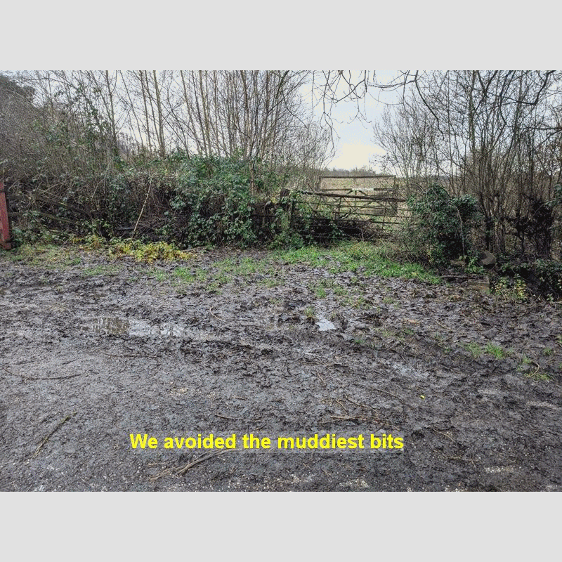 Here, when we were nearly arrived at Oaks Road, the footpath joins one coming down from Ratchett Hill behind us, and we turned northeast to leave the field at Oaks Road.