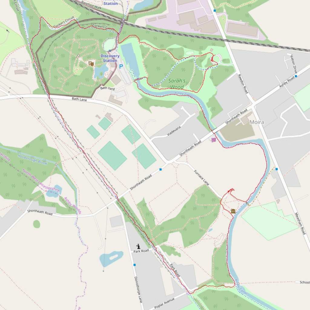 Photos by John DoghertyTwo of us met at the meeting point car park. As it was raining we decided to have a coffee so walked to the Hub Cafe. On the way there we met 2 more walkers who hat parked elsewhere at the Furnace and we all went for coffee and discussed next months walk among other things. After coffee we found the weather had brightened and the little bit of rain had stopped so we walked to Donisthorpe at least the Woodland Park and back along the old railway to Moira Furnace. It took about an hour. As no-one had recorded the journey I have included a map of the trial walk which is almost the same. The distance is about 2 miles