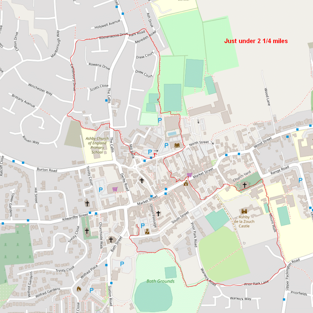 We arranged for a limit of 12. The ramblers association have agreed a limit of 30. In the event 2 people could not make it so the band of 10 set off around the bath grounds and out across the field whose name I am not sure of to the castle and out onto South street. We then walked past St Helen's Church and down Range road to the School playing field and out down the footpath that comes out opposite B&M stores. We then crossed the Nottingham road and entered the Tesco industrial estate and took the footpath just before the entrance to United Biscuits warehouse entrance. We followed the footpath to North street and took the mews back to the high street and then to Kilwardby street to La Zouch where we were welcomed for coffee. The route is just under 3 miles.