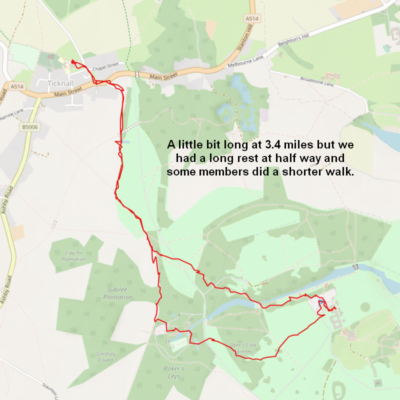 Photos by John Howlett12 members assembled in the Ticknall village hall car park for a walk into Calke. The proposed walk was 3.7 miles, a bit outside the maximum distance but as everyone was up for it we set off. We took the new path that follows the edge of the wood just outside the main park area. We stopped at the sign describing the new hub they are bulding. We continued past the building site and took the main path into Calke. This brought us into the park where the road takes a sharp left. We followed the road, mainly walking on the grass, to the cafe. Here we stopped for a drink and comfort break. After the short pause we crossed the car park, took the path towards Ticknall and when we reached the entry road we followed this to the main entrance, crossed the road and took the back way to the car park. The weather was fantastic throughout and the distance 3 3/4 miles was completed in 2 1/2 hours.