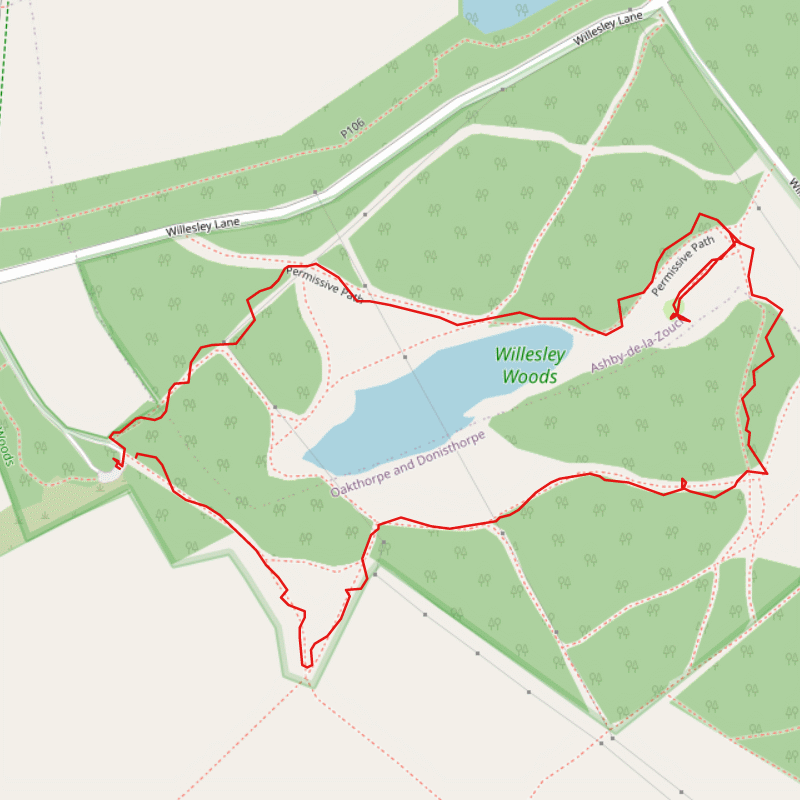 We set off on the track nearest the Willesley lane and followed the gravel track and onto the grassy track right up to the North Western edge of the woods where we found workmen laying a new path. We followed the new path down to the lake where we struggled over a net the workmen had placed to block the path. We then went around the lake and down to the site of the old Oakthorpe pit.