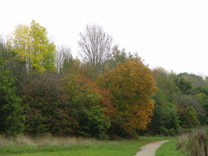 The route took us anti clockwise round the top of the northern lake, along the long western boundary of the Park, then back to the west shores of the central lake. En route we stopped off to watch the wild birds out on the water, including gulls and ducks, but no Canada Geese. Possibly because they had all started their long journey to their winter home. The weather stayed dry and mild, and the route now bent round the southern end of the central lake and turned towards the east side. Just as the straight path leading back to the bottom car park came in sight, a bridleway up to the top car park presented itself, and the party steadily climbed upwards. This path is preferable to the road, as it is easier on the feet and inclined much less steeply. As we regained the far end of the car park, away from the cars, we found dog training lessons in progress.