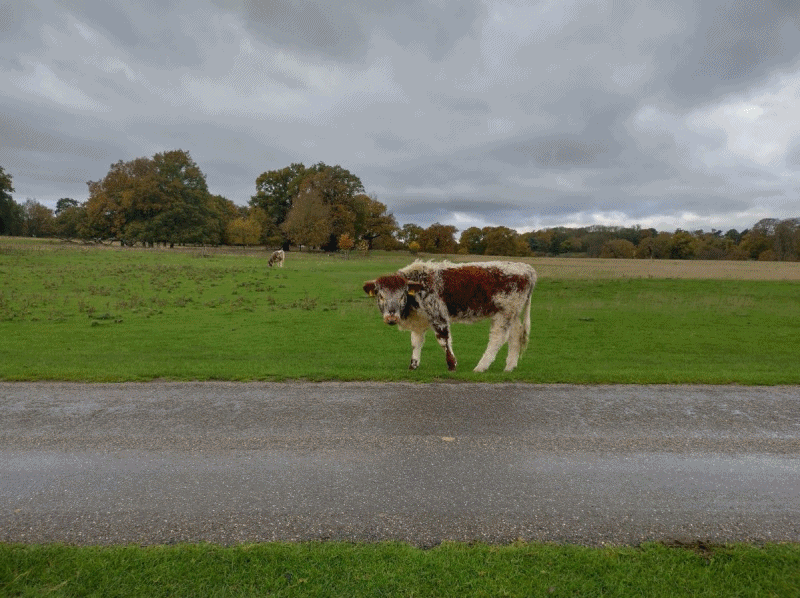The party continued then down the track to the south side of the hill, stopping ever and anon to watch the varieties of cattle grazing nearby, including British Longhorn and Highland cattle. These ferocious looking beasts are in reality some of the gentlest creatures you could wish to meet.