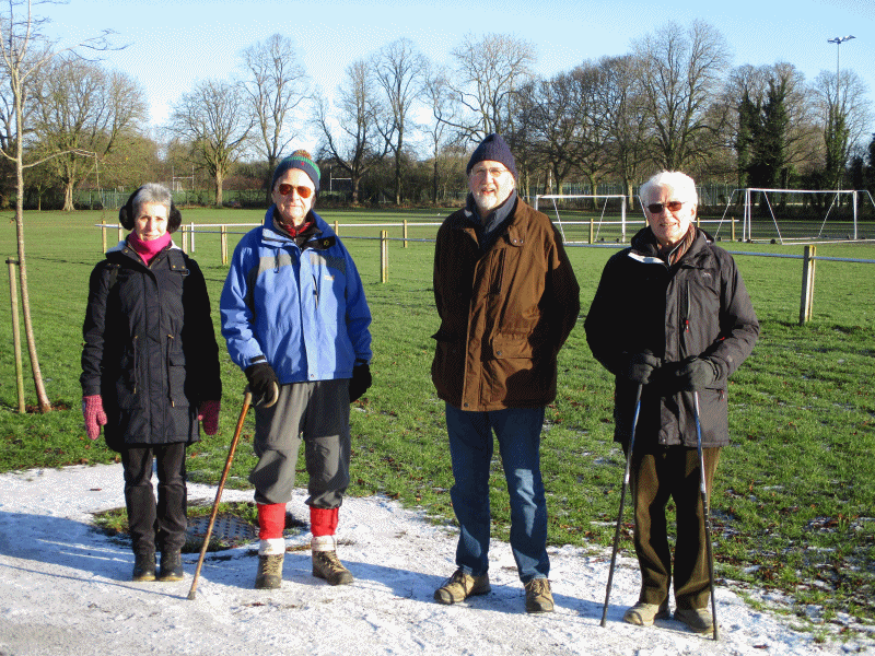 Photos by John Dogherty & John Howlett8 walkers met on the Green on a perfect day for walking except the ground was icy and we had one faller but that came later. Two of the party were new to the group as we set off through the park as far as the new bridge where we crossed into the estate where the soap factory had been. We then crossed the Smisby road into the French homes estate and climbed up to the path to the flour mill but instead turned right to come to the Burton road opposite Hill street. We turned right along Burton road and thence into Churchill Close. We took the path from Churchill Close to Highfields and then up the Moira road to the footpath leading through the allotments and onto Wilfred Gardens where the fall occured. We then took the new path around Bath grounds anto Prior park road, South Street to the cafe replacing the forties themed cafe.