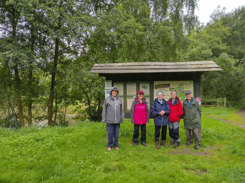 Photos by Margaret Howlett7 stalwart short walkers met in the car park and 6 were photographed by the leader. We met despite the warnings of heavy rain. We set off towards Albert village as we got to the path down to the lake it started to rain. The forecast was correct. The rain was heavy and as we left the lake and headed to the footpath to Spring Cottage it was unrelenting. At Spring Cottage we took the old railway track now a metalled path. We came to the crossroad where we went our different ways, three went back to their cars, one walked home and four stopped at the YHA cafe before returning to their cars. Hence two maps 3 miles for the early returners and 3.5 miles for the refreshment route.