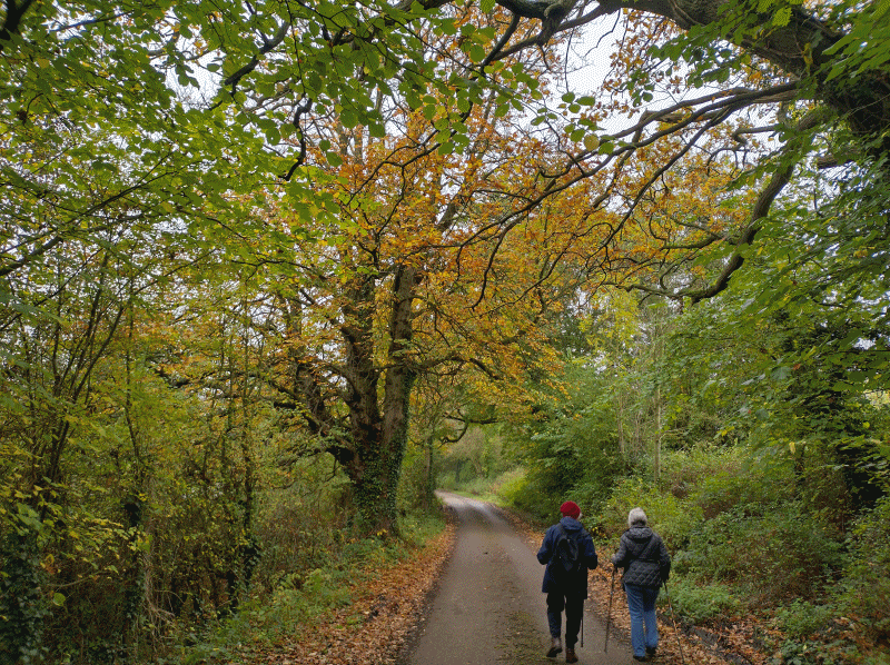 We rejoined the access road, this time following it back north westerly towards the main house. The weather stayed fine and mild, and the trees were beginning to show their autumn colours. The walking was good and so was the talking, although we had to step aside several times for cars enroute to the car park. When we got to the main house we paused for the obligatory team photo, then walked up the drive back to the Centre for coffee. The cafe now has an outside awning which made it possible for us all to sit together outside.